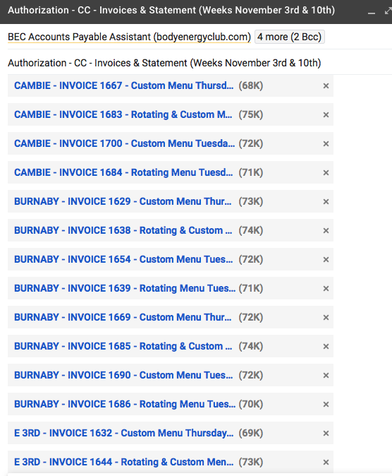 All invoices for the completed billing cycle should already be saved in pdf and filed in the appropriate google drive folder of googledrive-wholesale-BEC-billing&store info-invoices-year-month-billing cycle FOLDER-store