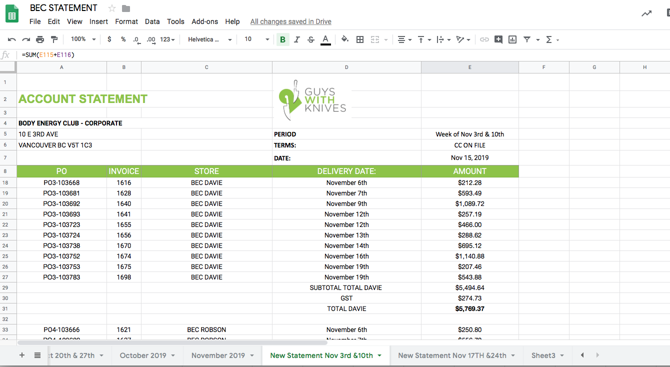 Now, it’s time to finalize and confirm the Account Statement for the completed billing cycle found in google drive-wholesale-BEC-billing&store info-account statements-BEC Statement and toggle to the correct billing cycle tab.