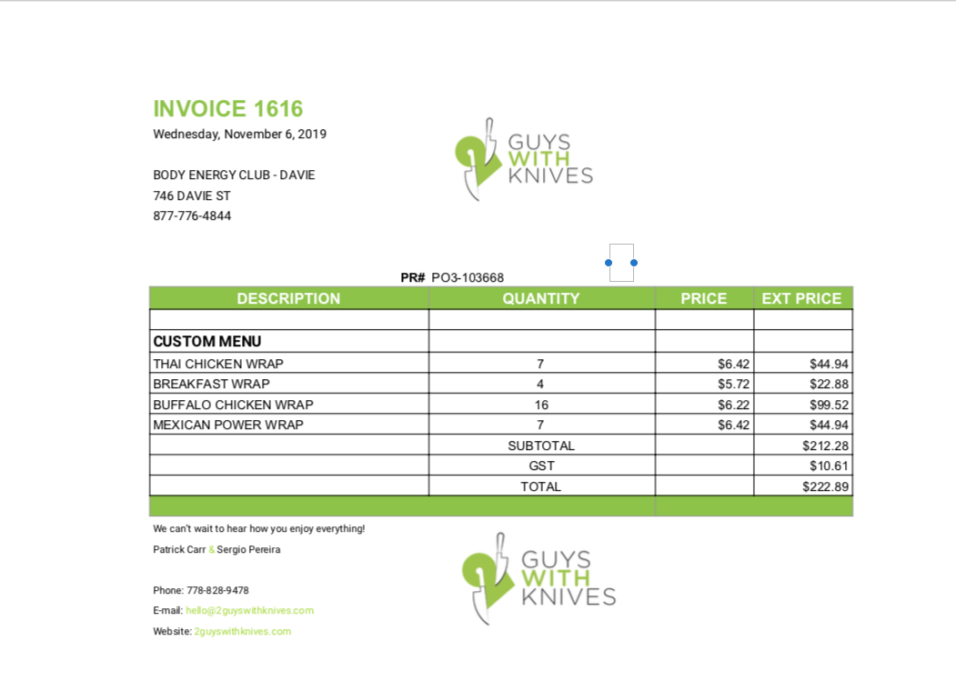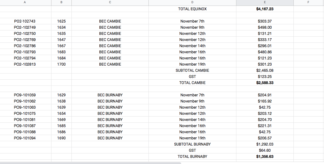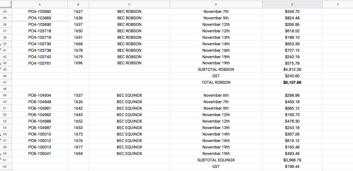 Using the Davie Store’s invoice below for Nov 6th delivery you will see that all of the information (invoice number, PO info, Sub-total excluding GST, delivery date) matches correctly on the Account Statement above