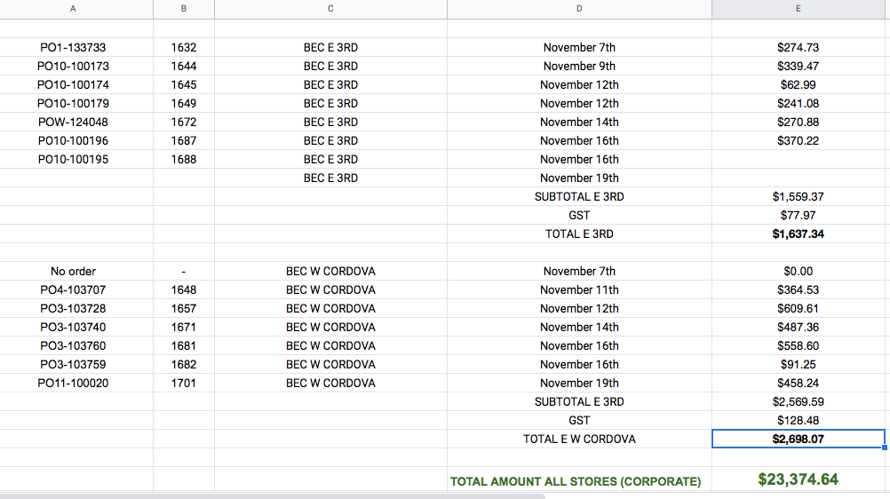 - Confirm one by one that the sub-total amount (excluding GST) for each store is correct