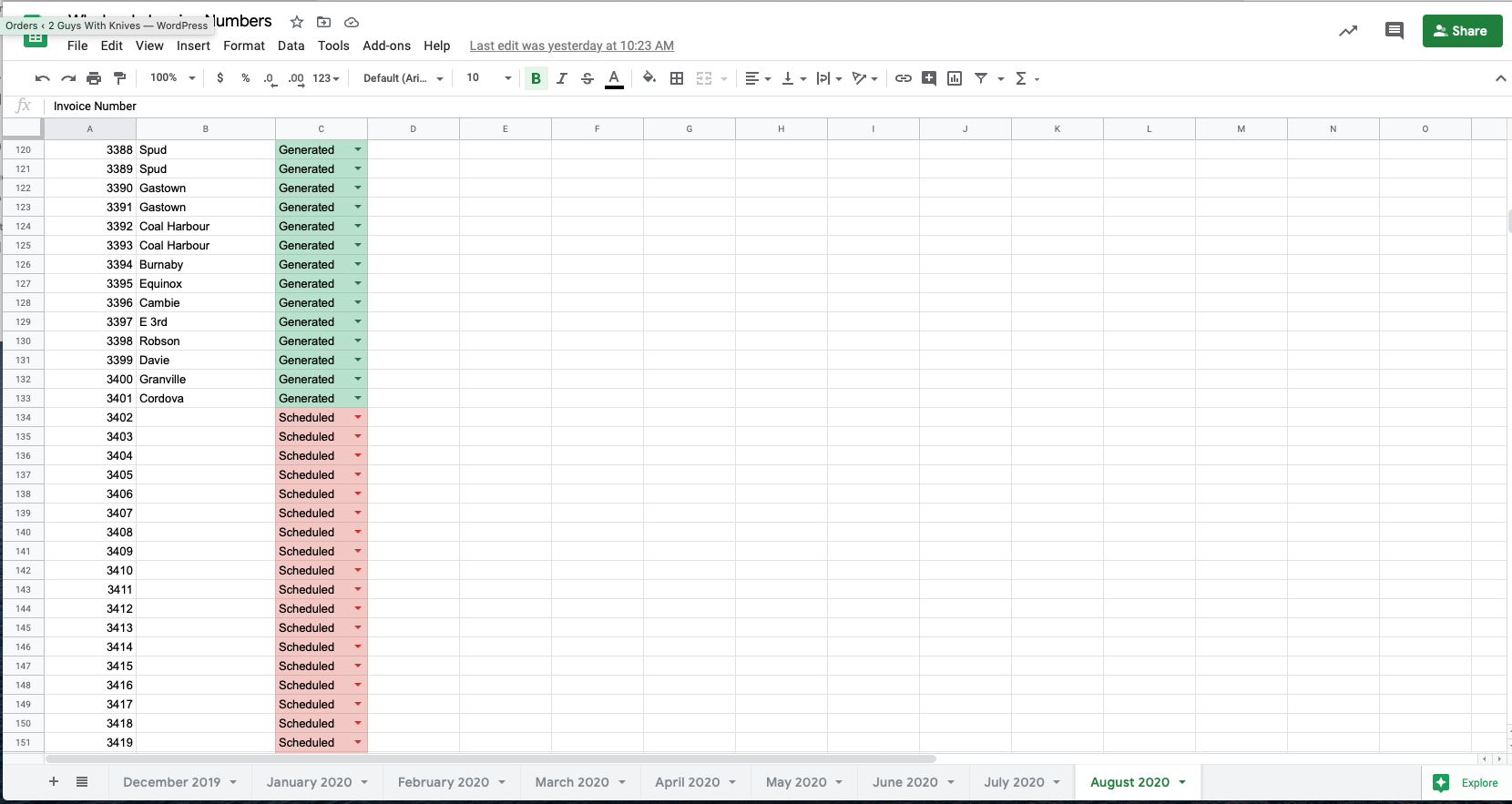 In Google Drive, go to wholesale file, so we have a sheet called Wholesale Invoice Number.