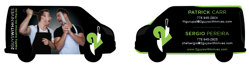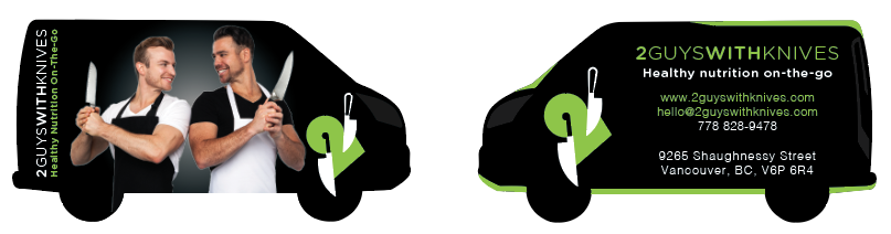2 Guys with Knives’ current business cards are double-sided and have a unique van shape, making them more memorable. There are 2 style options used: one for Patrick and Sergio, and a general one: