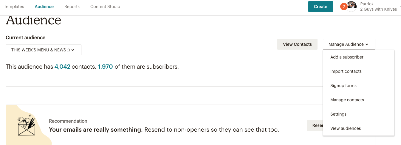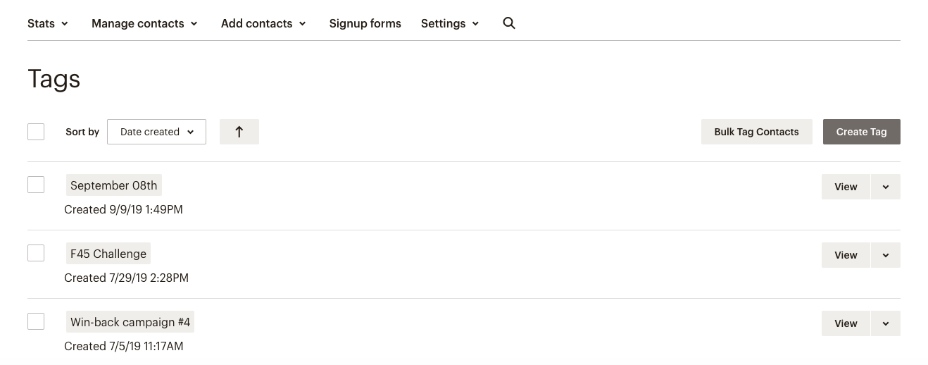 In the MailChimp main menu, choose ‘Audience’. Then, in the second menu, chose ‘Manage contacts’ > Tags.