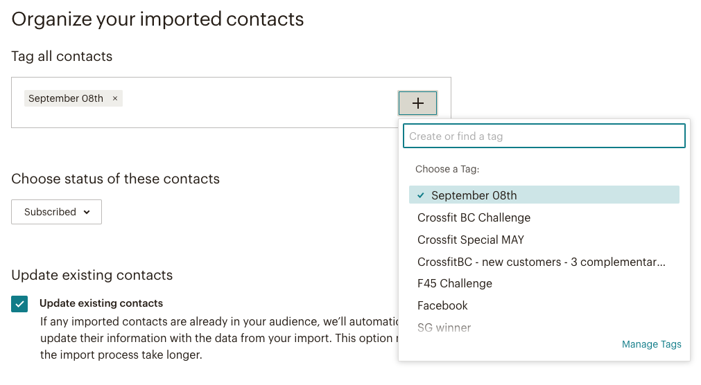 4th STEP: choose the tag you want to use to mark the contacts in the list you’re importing. The status of the contacts should be ‘Subscribed’ and the box for ‘Update existing contacts’ should be checked.