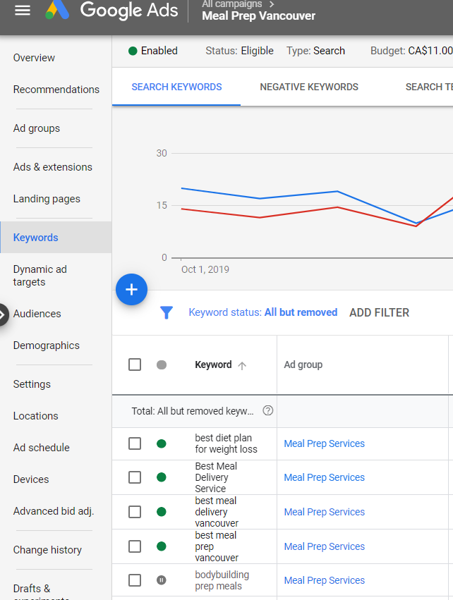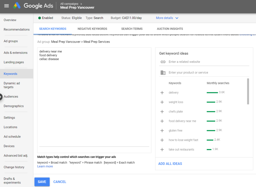 Take a look at this list. You’ll see that Google can be very ‘creative’ with search terms, activating our ads to searches for ‘Chinese restaurant’, ‘donut delivery’, ‘marijuana’ and even ‘gravel delivery’.