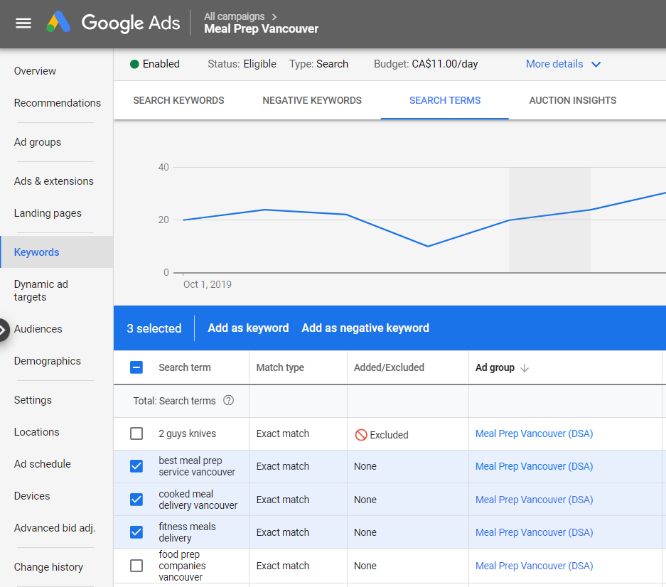 To add any search term as a keyword or a negative keyword, select them by clicking on the small square on the left of each search term, then choose an option: ‘Add as keyword’ or ‘Add as negative keyword’