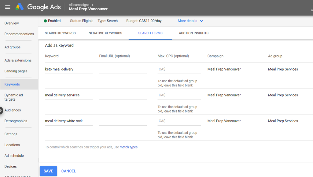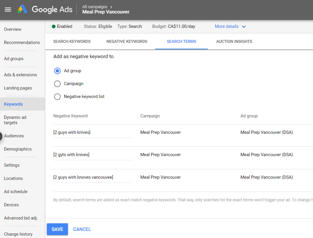 For adding negative keywords, you can choose excluding the search terms only for an Ad group or for the whole Campaign. Click on the ‘Save’ blue button.