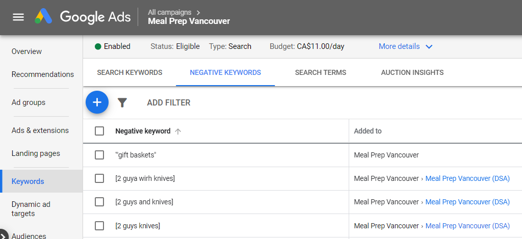 For example, the name ‘2 Guys with Knives’ and variations are excluded. Why? Because if a person searches for the name of our company, he/she already knew about us and will find us anyway. So no need to spend money by clicking ads with this person. The purpose of the ads is to attract new clients!