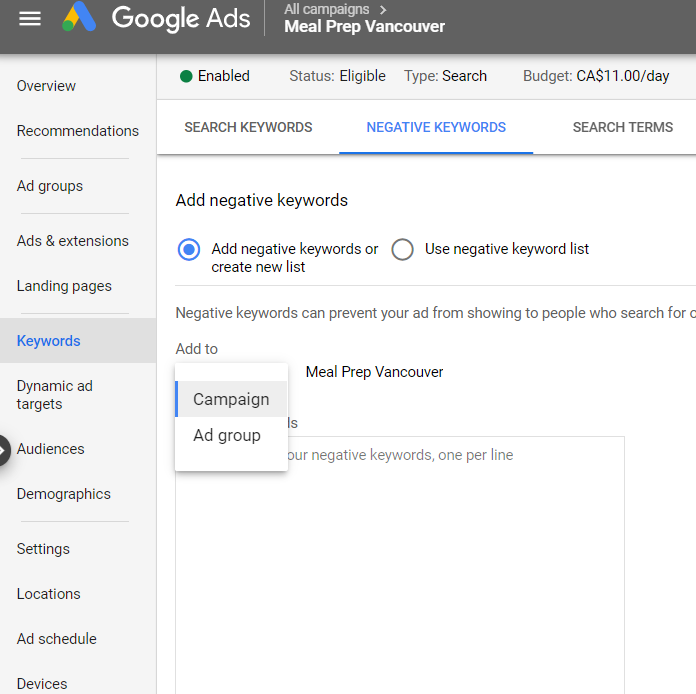 Choose if you want to add negative keywords to the whole campaign or only to an ad group. Type the negative keywords.
