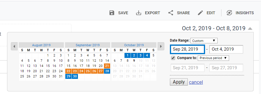 To pick a timeframe, go the date on the top right corner, and choose the period you want to analyze, and also if you want to do a comparison. The chosen timeframe will be represented by a blue colour, and the previous period in an orange colour. Click ‘Apply’.