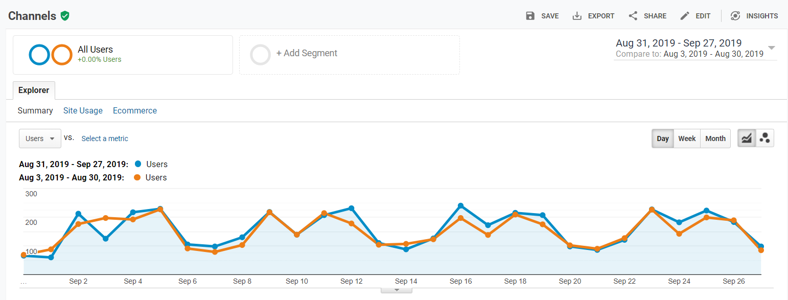 Here is an example of a Google Analytics report: Analytics _Channels 20190831-20190927.pdf