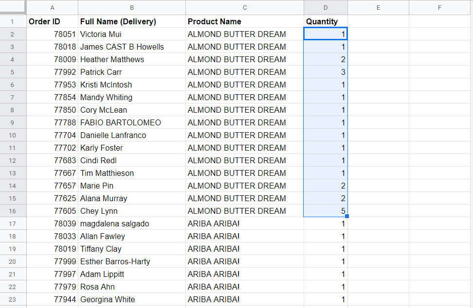The CSV file will contain Order ID, client’s name, product’s name and quantity. Open the CSV on an Apple Number’s document (or another spreadsheet of your choice), and sort it by ‘Product Name’. Now it will be easy to know how much of each product was sold.