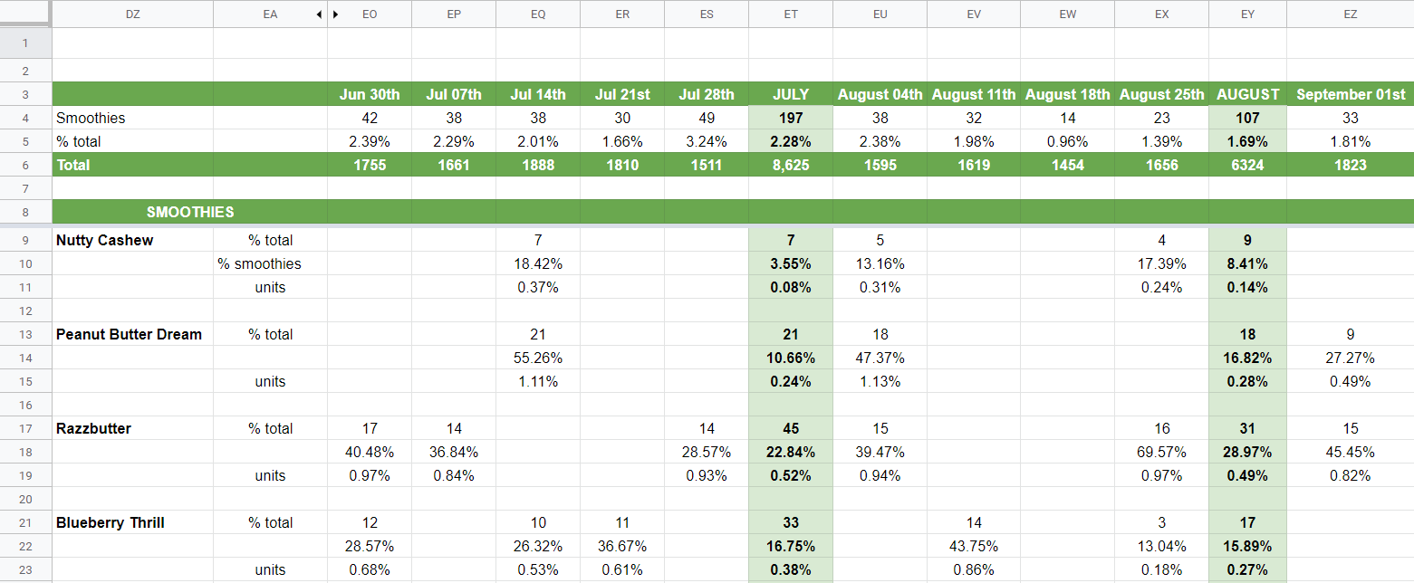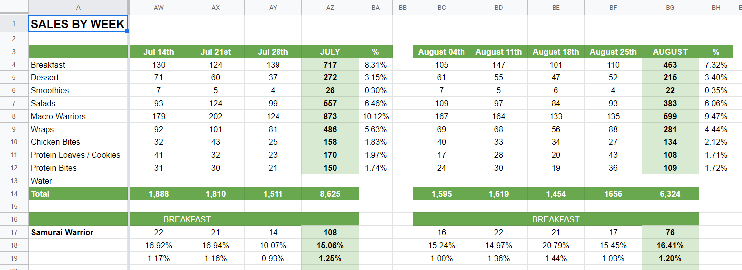If there is any new product, add rows for it in the appropriate category area (Breakfast, Salads, etc). Remember to adjust the SUM formula of the category on the top of the spreadsheet to include the new item.