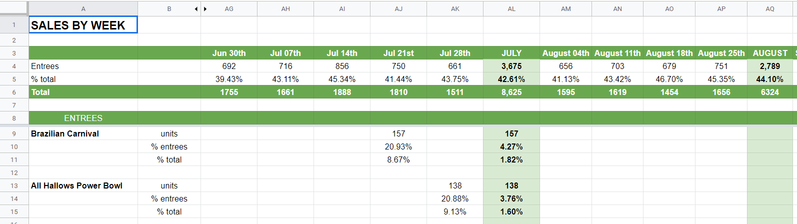 Note that the rotating item of the menu – Entrees, Juices, Wellness Shots, Bottled Smoothies and Soups (this only in the winter) – will be on the other spreadsheet, ‘rotating menu’, and we will talk about on the next step.
