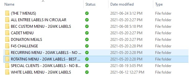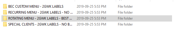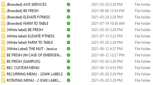 - (THE 7 MENUS): These are the labels of the items we’re currently selling on a rotating basis (Since the beginning of summer 2020). It includes labels from our rotating menu (Entrees) and items from our recurring menu, breakfasts, breakfast boxes, macro meals, desserts, etc. This is one of the most diverse folders as it includes items from all the general recurring menus classified in individual folders for each week. This folder gives us a sales advantage over the conventional structure of having a set recurring menu for the season and having the entrees rotate every week. Why? I am glad you asked:)