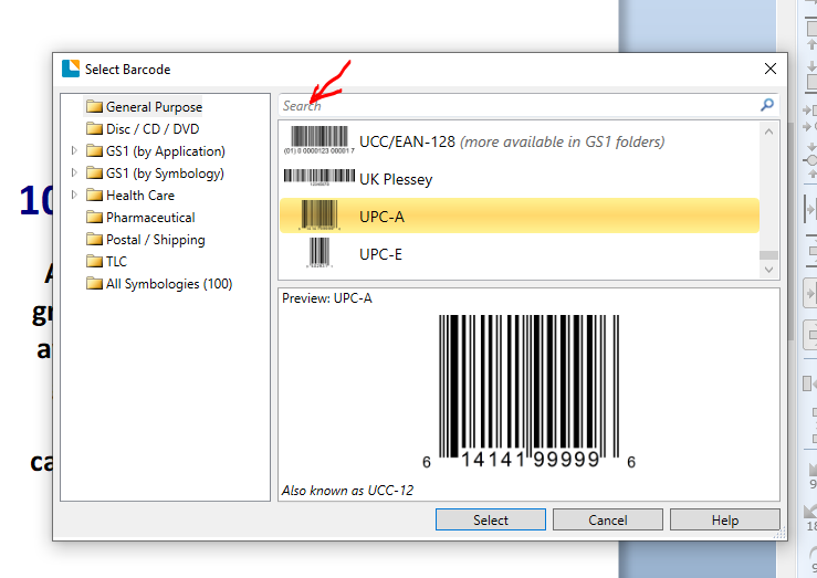 Now, you can select which barcode you’d like to use. Usually for our wholesale clients we use the UPC-A barcode format as it is the most commonly used and easiest to scan. Click on the UPC-A barcode option & click “select” and the barcode will drop automatically onto the label file.