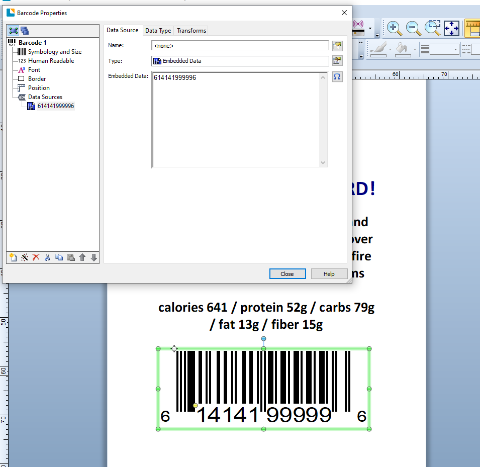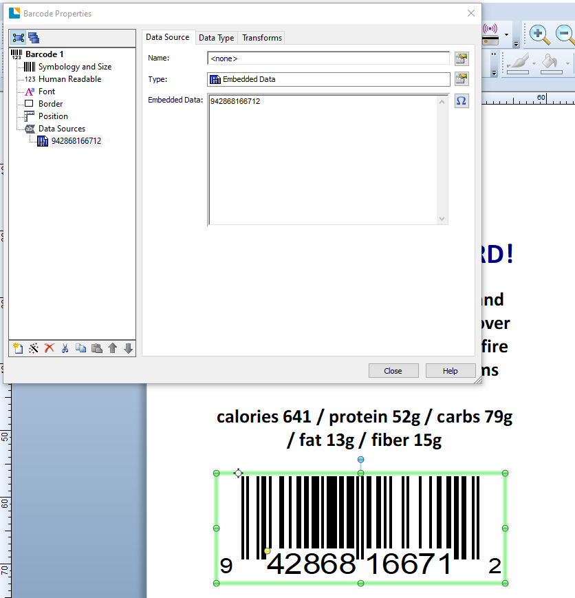 Now it’s just a matter of right-clicking on the barcode and selecting “properties” to modify the barcode number in the “embedded data” field shown below.