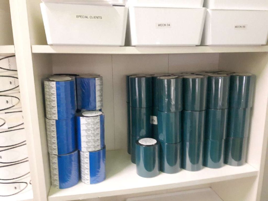 The Poly label products are used for the 2GWK black & green branded labels and for established white label account programs. (on the top two shelves) This label material has a shiny finish and can easily be removed from packaging. It repels water and has a very clean and sleek finish.