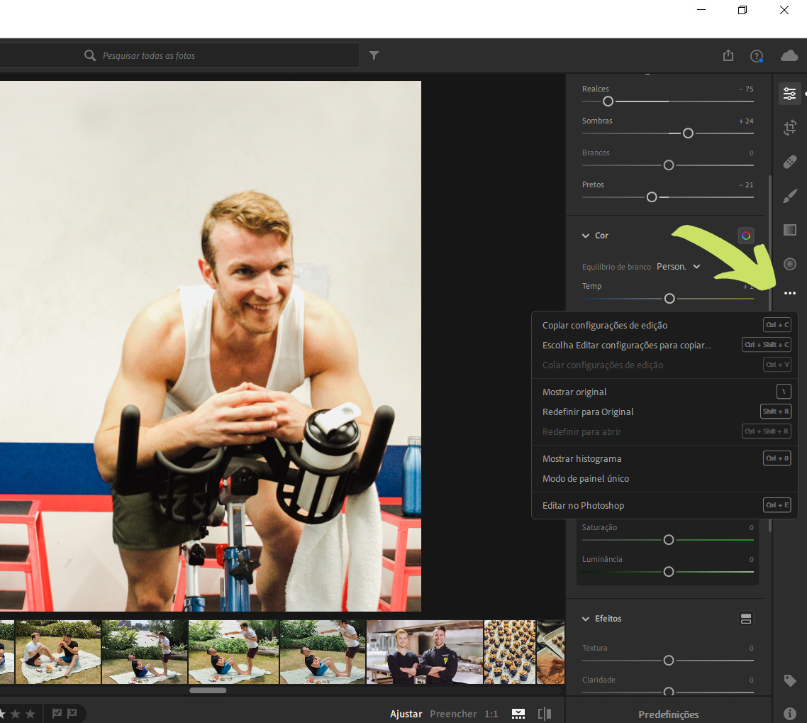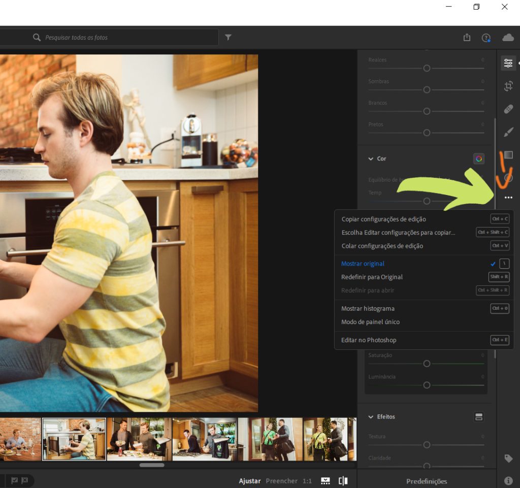 1: Open the photo that contains the preset on Adobe Lightroom and click on the 3 points of your tools column on the right.