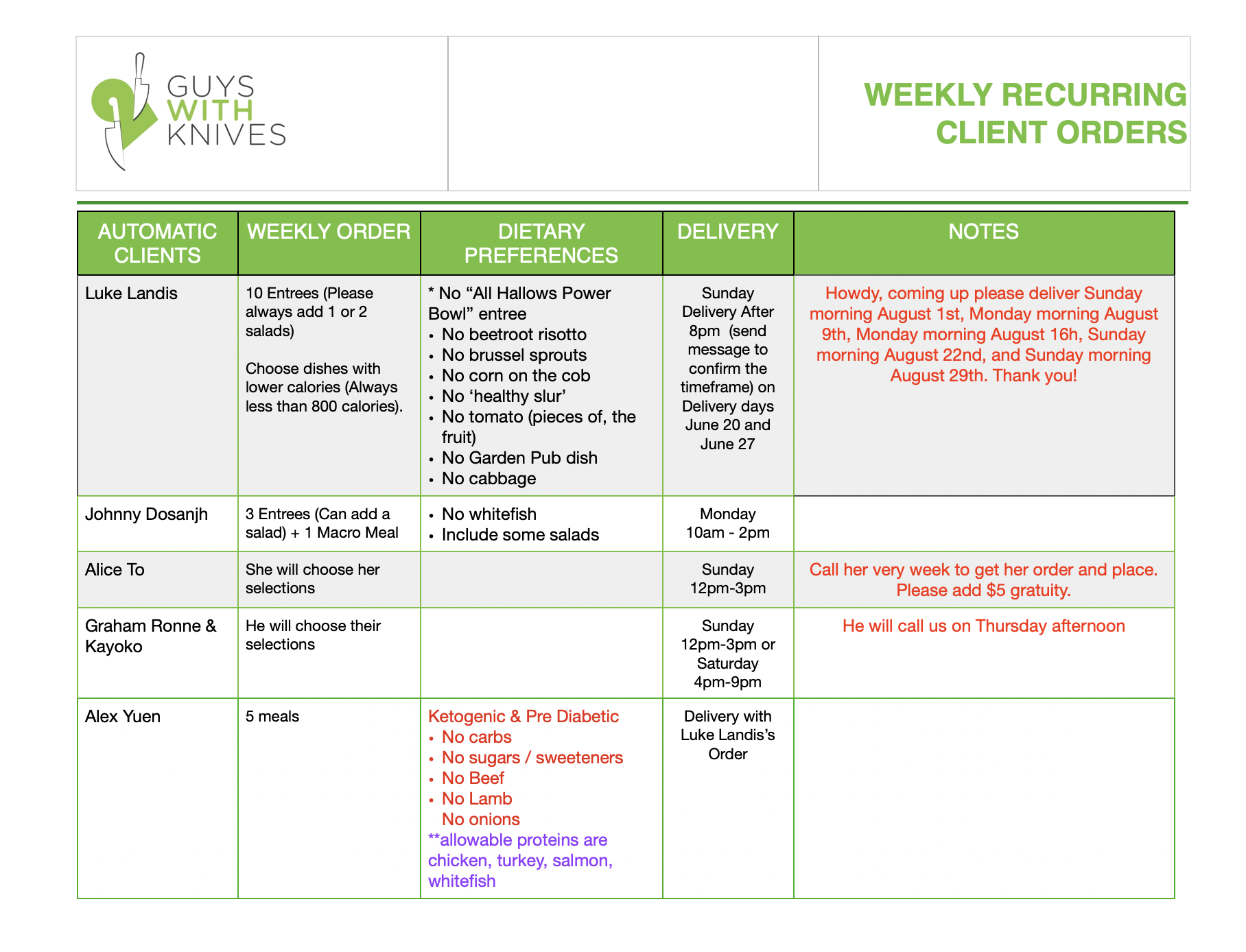 We have a recurring order program where we place the client’s orders for them each week within their volume and dietary preference parameters. This is done so they don’t need to go online every week to order. To be part of this program, the client can request it, or if you identify that this is one of their needs during a chat, you can always offer and explain how it works. The key is that we always want to make the experience as seamless and convenient for them as possible